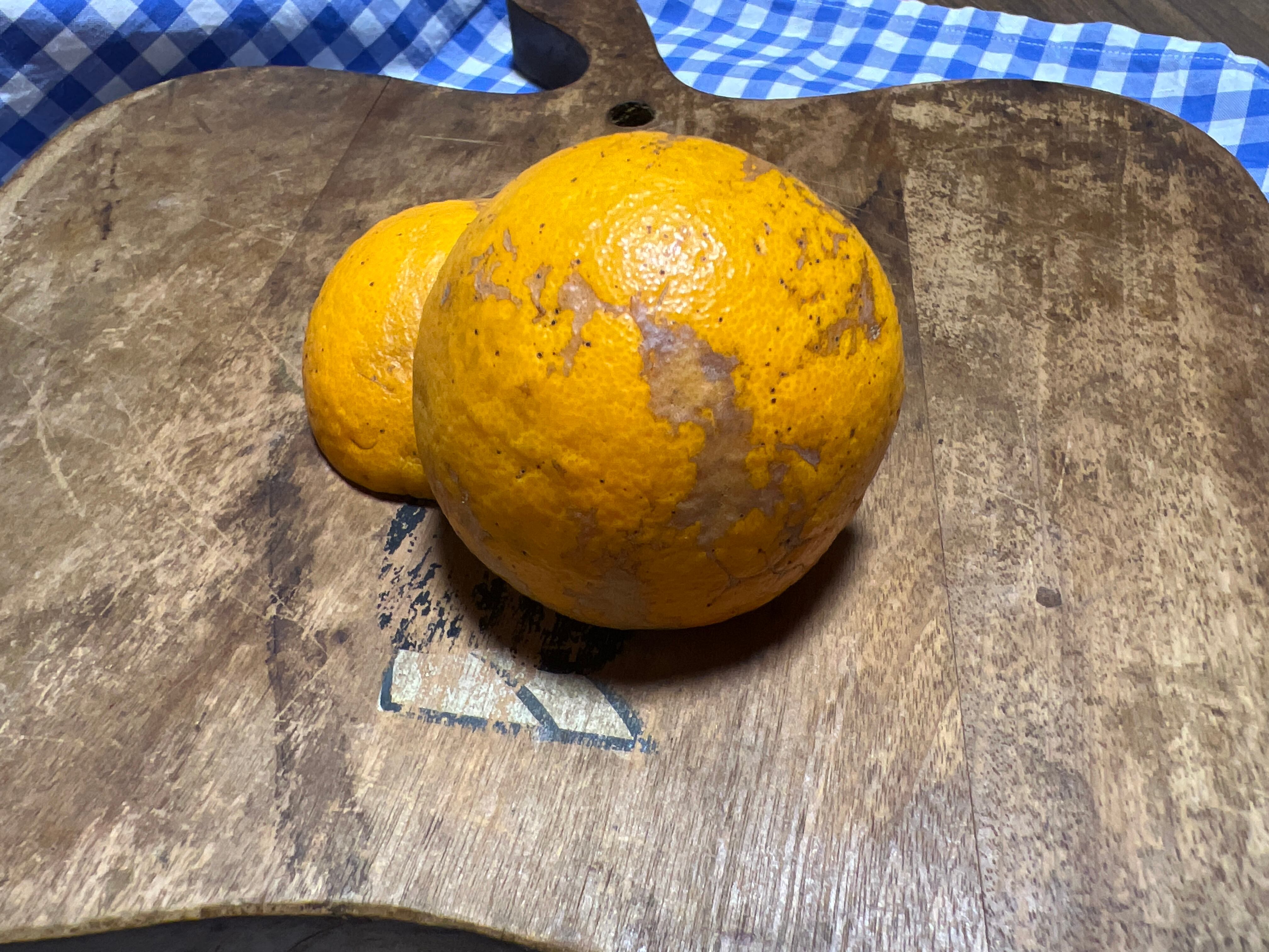 風雨にさらされる為どうしても写真の様な皮に擦り傷がございます。農薬を使用せずに栽培されることが殆どないオレンジですが、お客様の見た目に対する理解を深めて頂くことで栽培が継続できております。