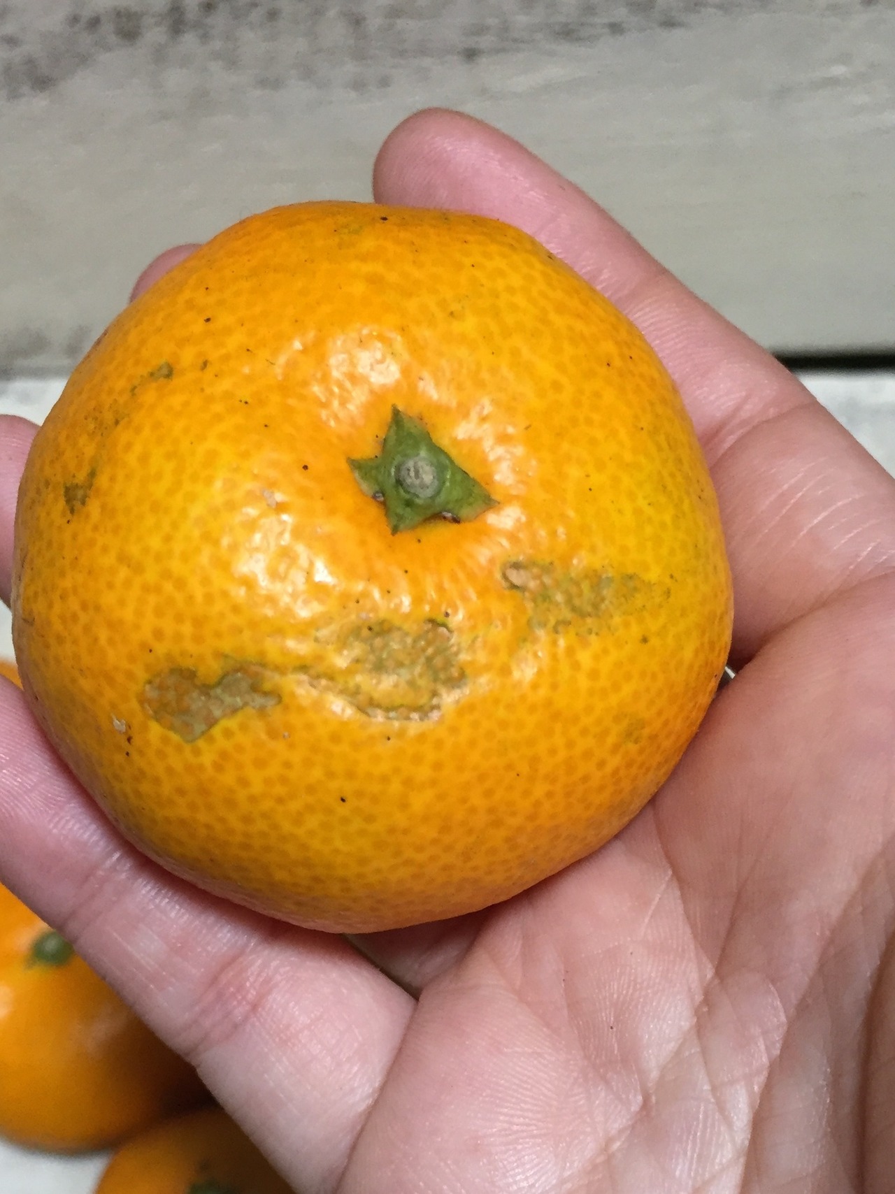 農薬不使用のためどうしても皮にキズやシミがあります。これは青い小さなみかんの時に主に虫に齧られた跡や酷暑での日焼けも影響しています。その点をご理解いただいた方のみご注文ください。